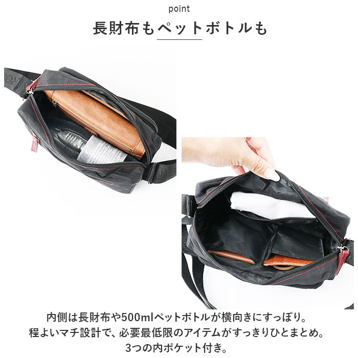 ・内側は長財布や500mlペットボトルが横向きにすっぽり。程よいマチ設計で、必要最低限のアイテムがすっきりひとまとめ。3つの内ポケット付き。