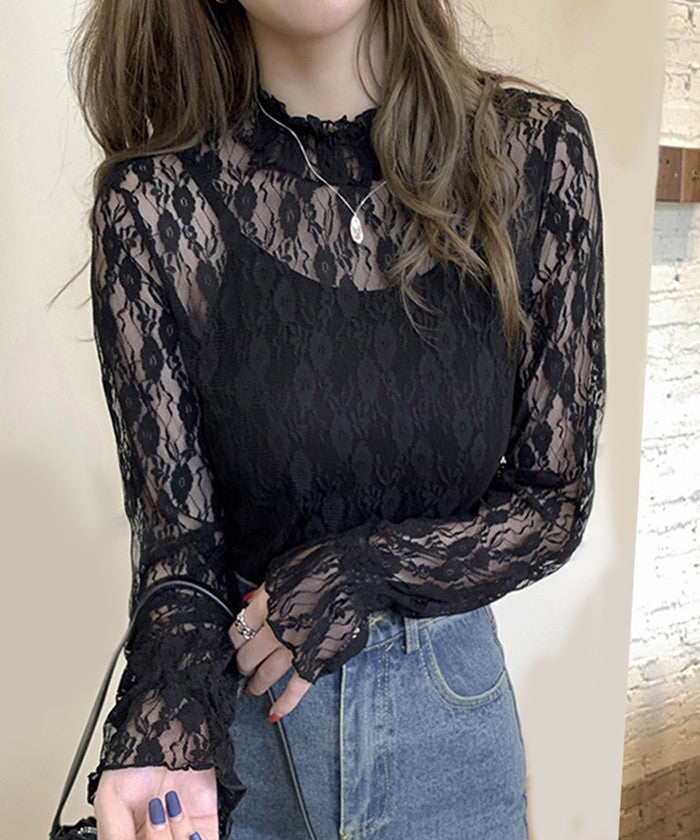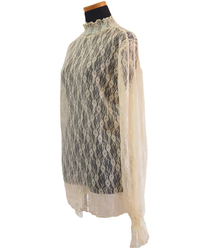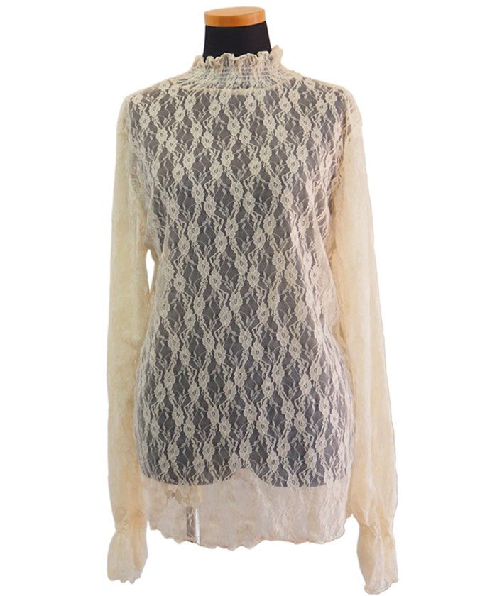 ・透け感が大人カワイイ、襟ぐりと袖口のシャーリングがアクセントのレースシースルーブラウス。
