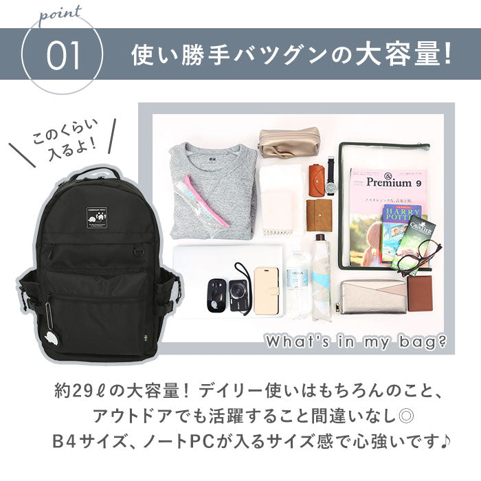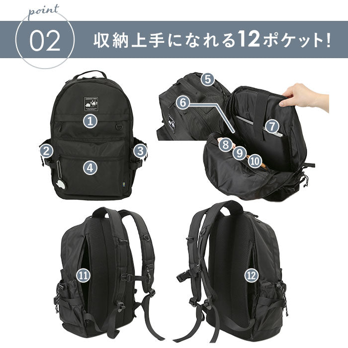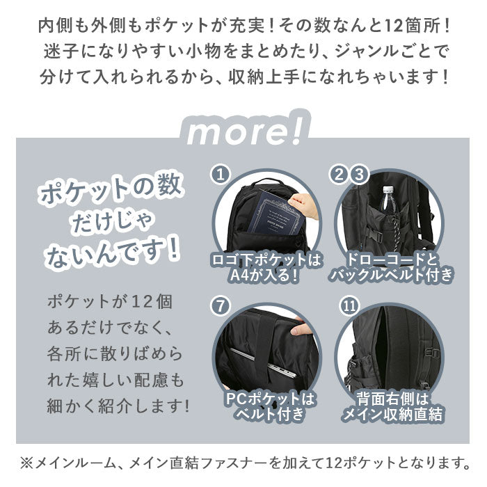 ・約29Lの大容量!合計12個のポケットを搭載した、機能性バツグンのデイパック。(※メインルーム、メイン直結ファスナーを加えて12ポケット仕様となります。)