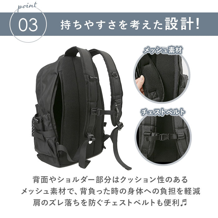 ・背面とショルダーベルトにはクッション性のあるメッシュ素材を使用、チェストベルトでズレ落ちを防ぎ快適な背負い心地◎