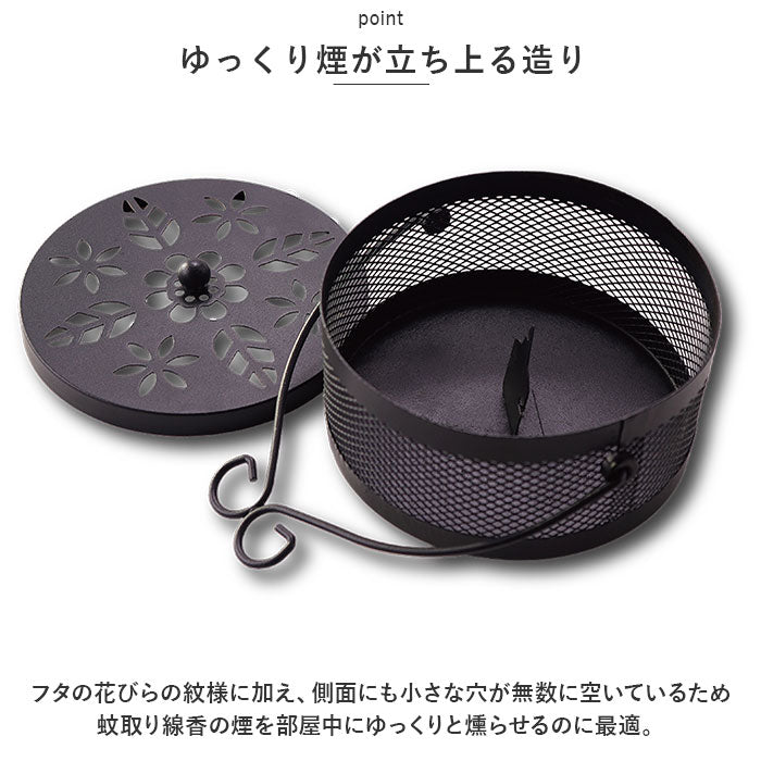 ・和風鉄器のようなざらついたスチール素材表面に、優雅な花びらや葉の紋様の型抜きを施したレトロで存在感のある蚊取り線香ホルダー。