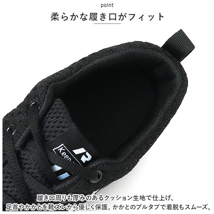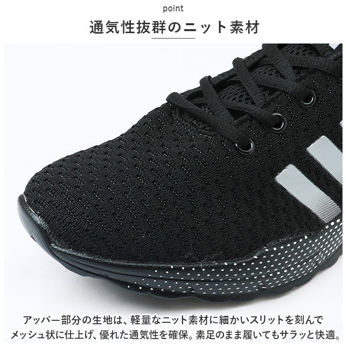 ・アッパー部分の生地は、軽量なニット素材に細かいスリットを刻んでメッシュ状に仕上げ、優れた通気性を確保。素足のまま履いてもサラッと快適。