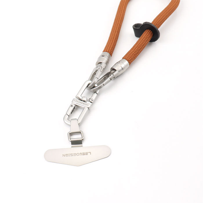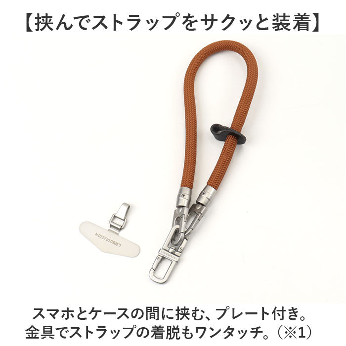 ・スマホとケースの間に挟む、プレート付き。金具でストラップの着脱もワンタッチ。