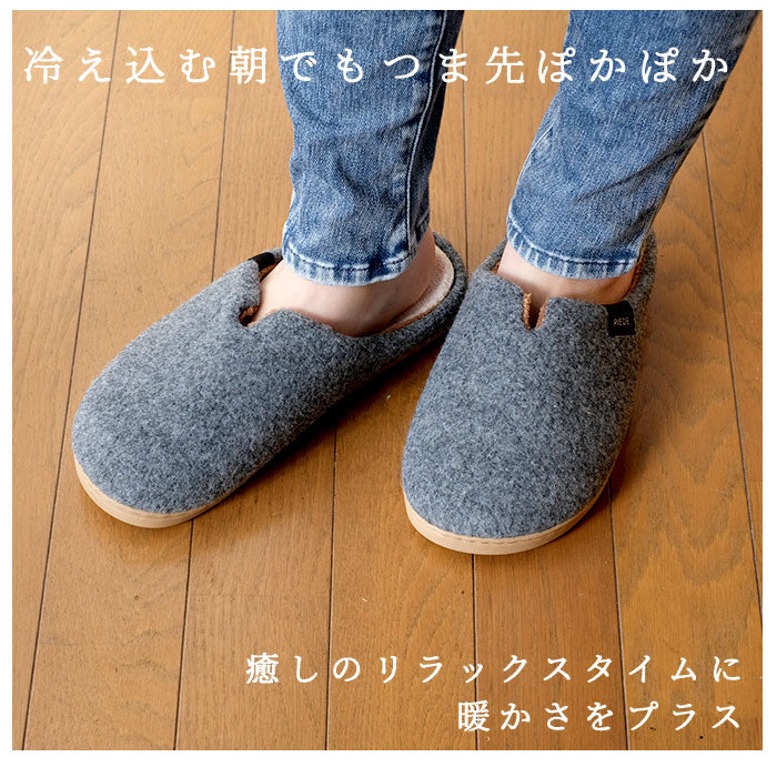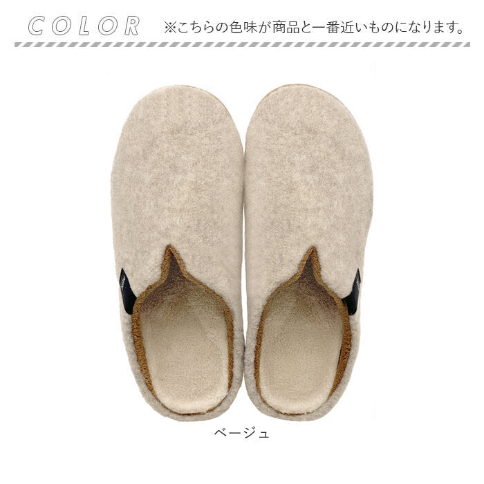 ・表面はマフラーみたいに落ち着いたトーンのフェルト生地、内側はぬくぬくのボア素材で仕上げた、コロンとまぁるいカタチが可愛らしいフェルトスリッパ。