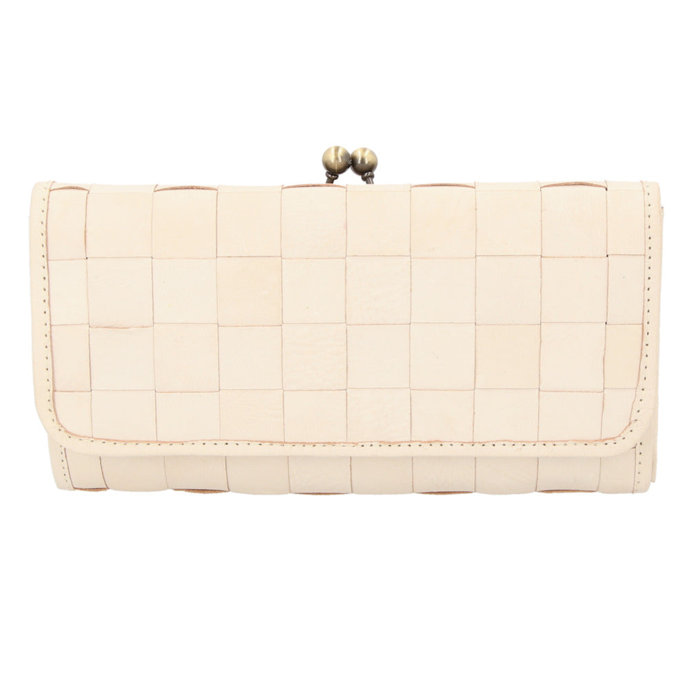 ・本格レザーをバスケットのように編み込んだ素材使いが可愛い!人気の編み込みがま口長財布に待望の新色「アンティーク調ホワイト」が仲間入り!
