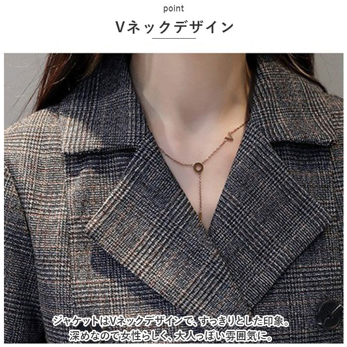 ・ジャケットはVネックデザインで、すっきりとした印象。深めなので女性らしく、大人っぽい雰囲気に。