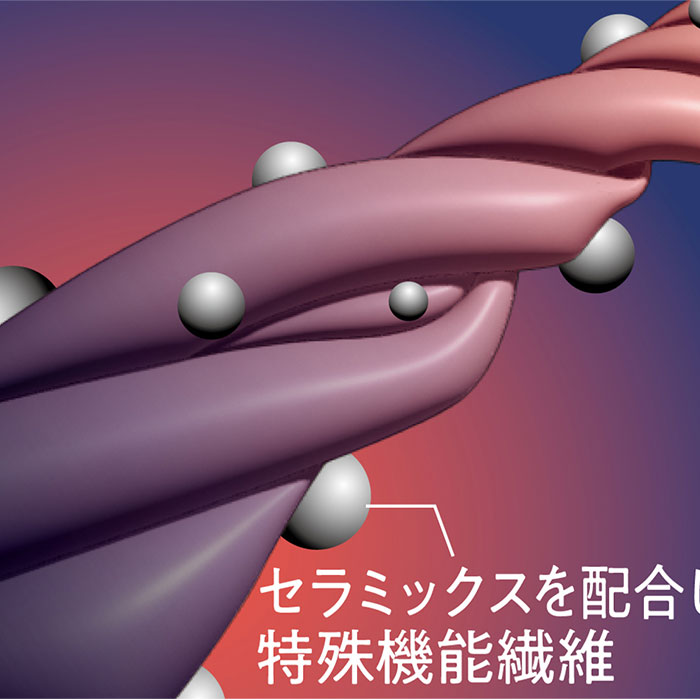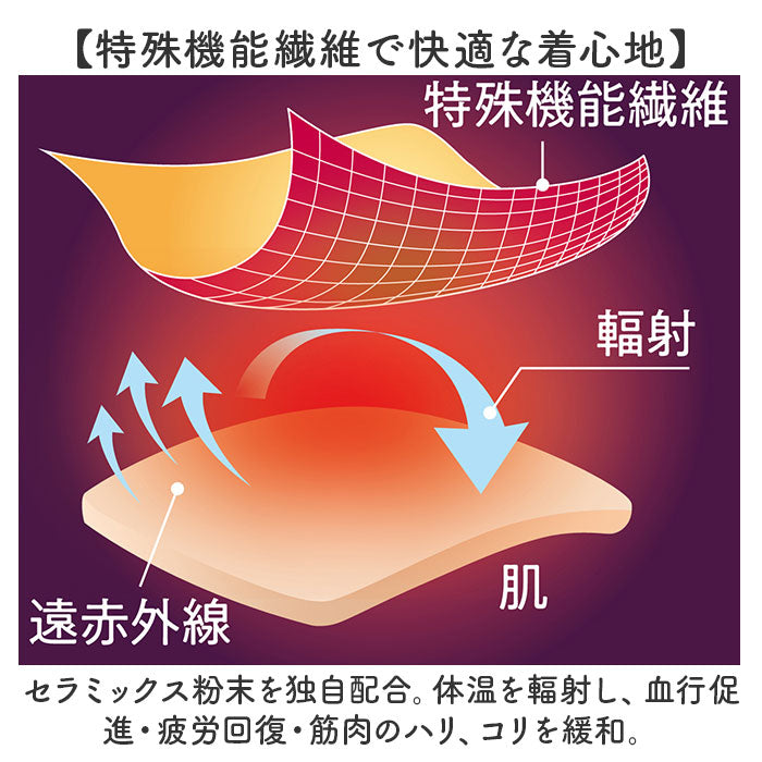 ・セラミックス粉末を独自配合。体温を輻射し、血行促進・疲労回復・筋肉のハリ、コリを緩和。