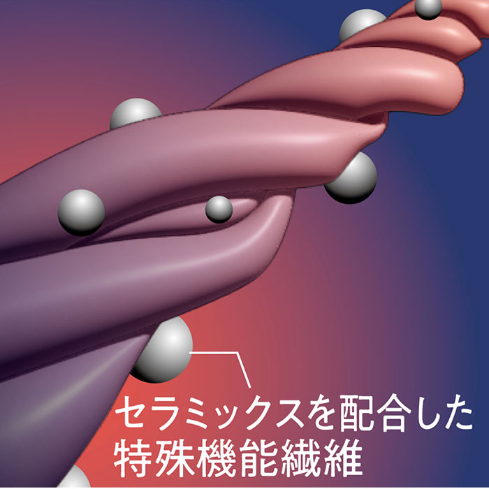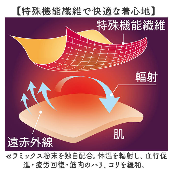 ・セラミックス粉末を独自配合。体温を輻射し、血行促進・疲労回復・筋肉のハリ、コリを緩和。