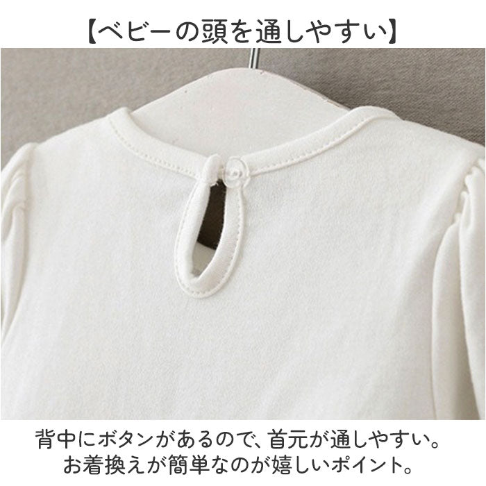 ・背中にボタンがあるので、首元が通しやすい。お着換えが簡単なのが嬉しいポイント。