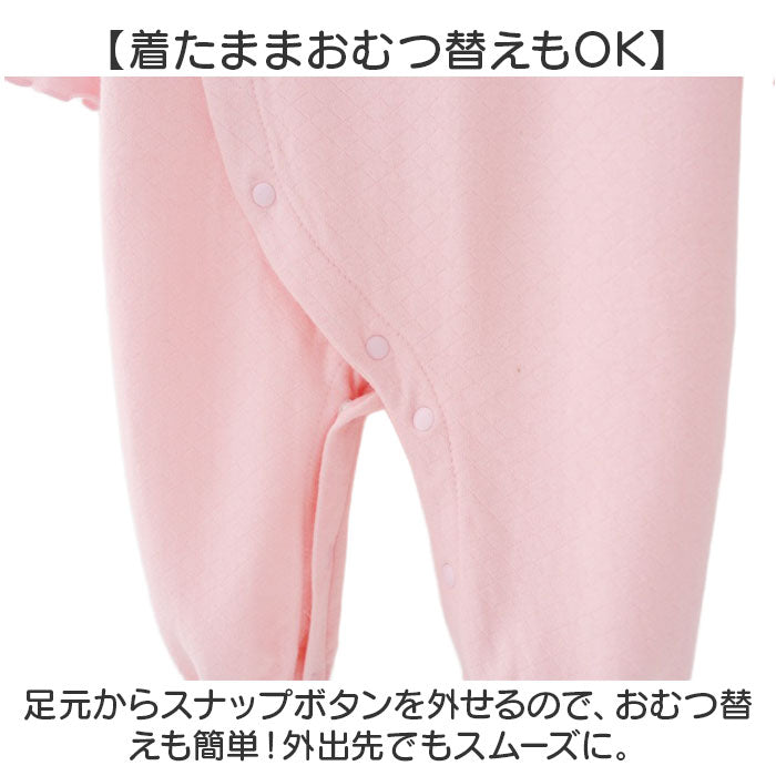 ・足元からスナップボタンを外せるので、おむつ替えも簡単!外出先でもスムーズに。