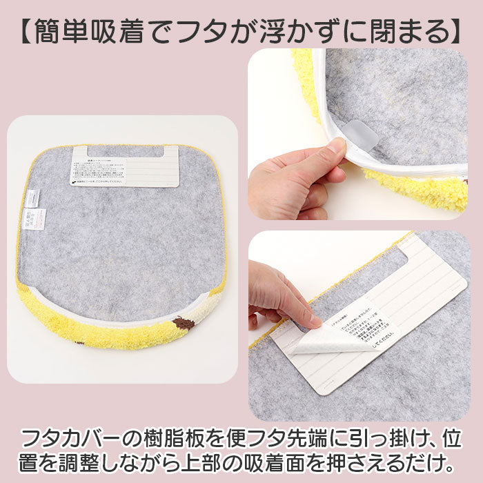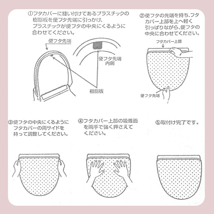 ・フタカバーの樹脂板を便フタ先端に引っ掛け、位置を調整しながら上部の吸着面を押さえるだけ。