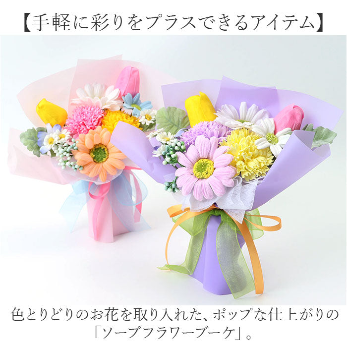 ・色とりどりのお花を取り入れた、ポップな仕上がりの「ソープフラワーブーケ」。