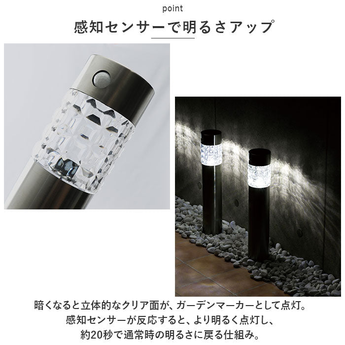 ・暗くなると立体的なクリア面が、ガーデンマーカーとして点灯。感知センサーが反応すると、より明るく点灯し、約20秒で通常時の明るさに戻る仕組み。