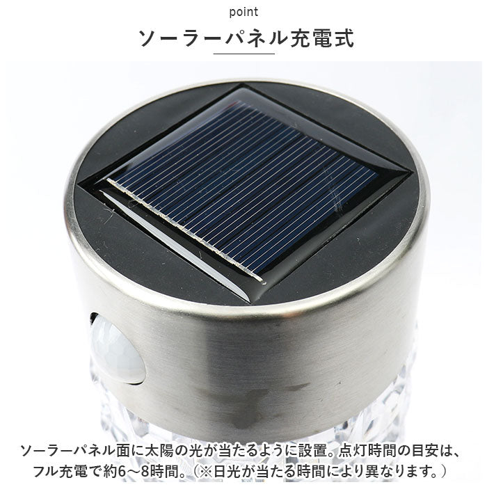 ・ソーラーパネル面に太陽の光が当たるように設置。点灯時間の目安は、フル充電で約6~8時間。(※日光が当たる時間により異ります。)