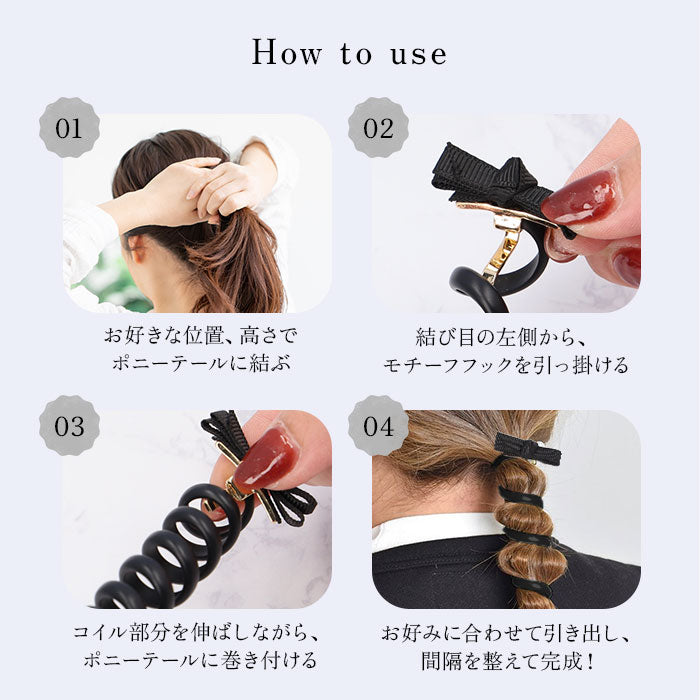 ・ヘアゴムで髪を結んだあとにフック部分を差し込み、そのままくるくる巻きつけるだけでOK!ヘアアレンジが苦手な方にもおすすめ。