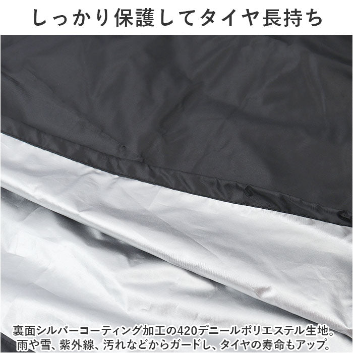 ・裏面シルバーコーティング加工の420デニールポリエステル生地。雨や雪、紫外線、汚れなどからガードし、タイヤの寿命もアップ。