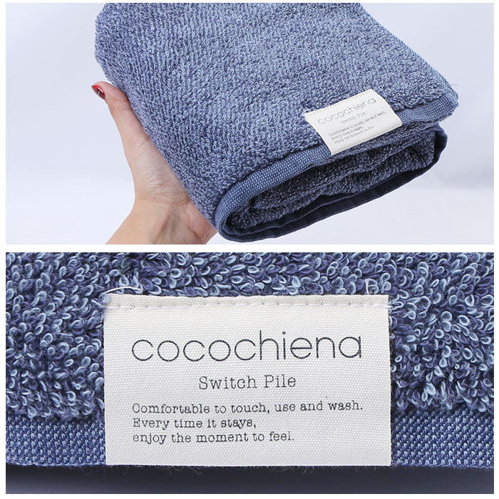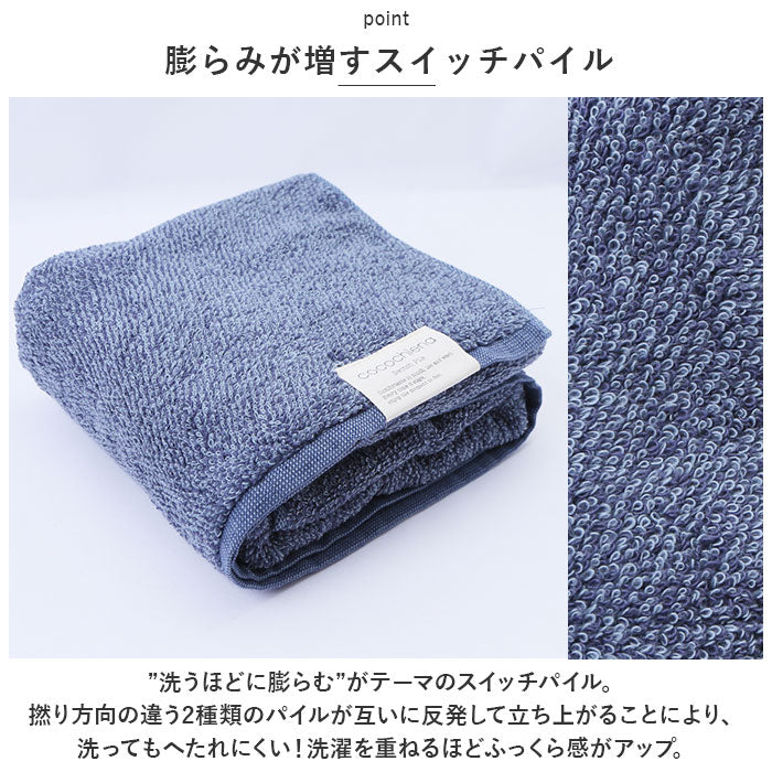 ・”洗うほどに膨らむ”がテーマのスイッチパイル。撚り方向の違う2種類のパイルが互いに反発して立ち上がることにより、洗ってもへたれにくい!洗濯を重ねるほどふっくら感がアップ。
