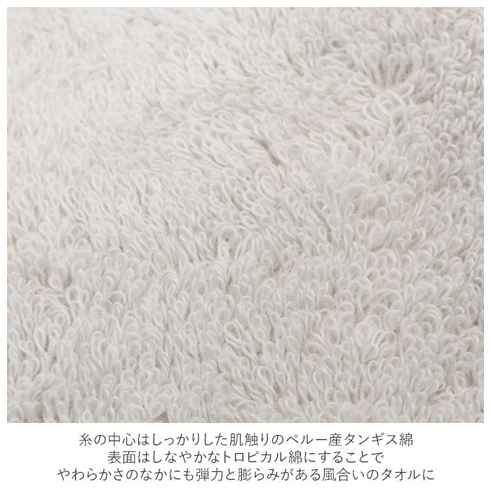 ・糸の中心はしっかりした肌触りのペルー産タンギス綿。表面はしなやかなトロピカル綿にすることで、やわらかさのなかにも弾力と膨らみがある風合いのタオルに。