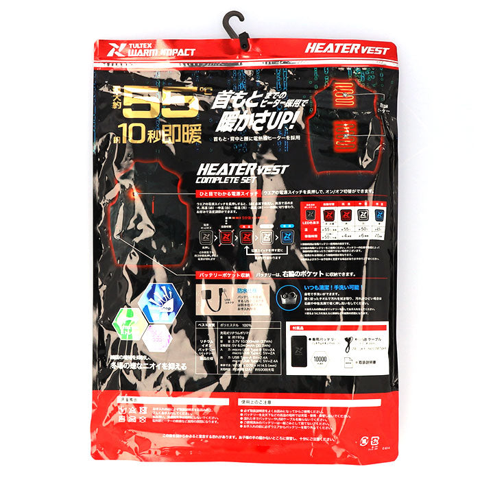 ・【セット内容】衿付きヒーターベスト、専用バッテリー(リチウムイオンバッテリー/10000mAh)、USBケーブル(Type-A/micro USB Type-B)、取扱説明書