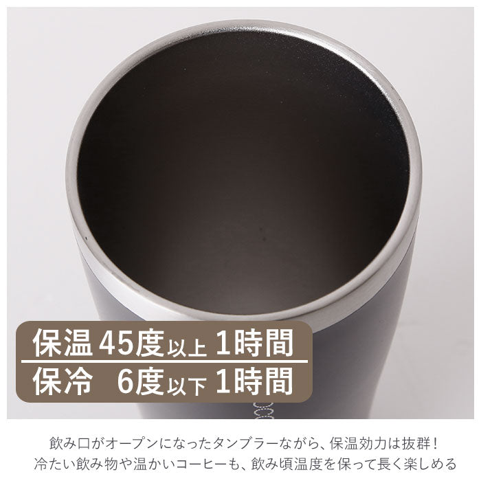 ・飲み口がオープンになったタンブラーながら、保温効力がは45度以上「1時間」、保冷効力が6度以下「1時間」。冷たい飲み物や温かいコーヒーも、飲み頃温度を保って長く楽しめる。