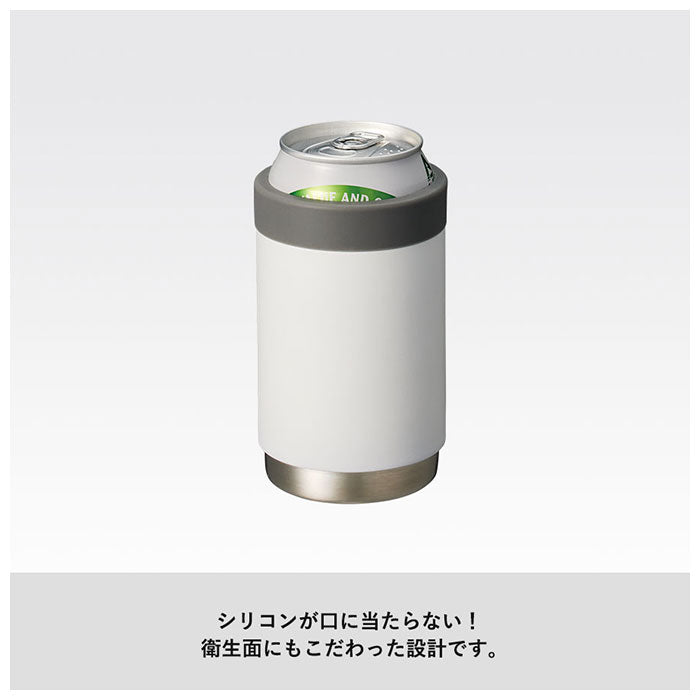 ・市販の350mlの缶を入れれば保温保冷してくれて、オリジナル形状のシリコンキャップがピッタリホールドしてくれる。