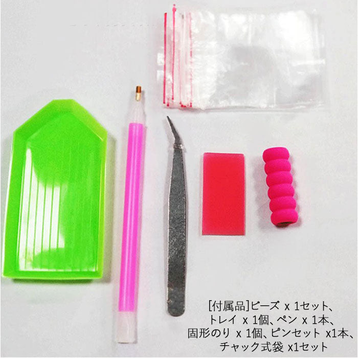 [付属品]ビーズ x 1セット、トレイ x 1個、ペン x 1本、固形のり x 1個、ピンセット x1本、チャック式袋 x1セット