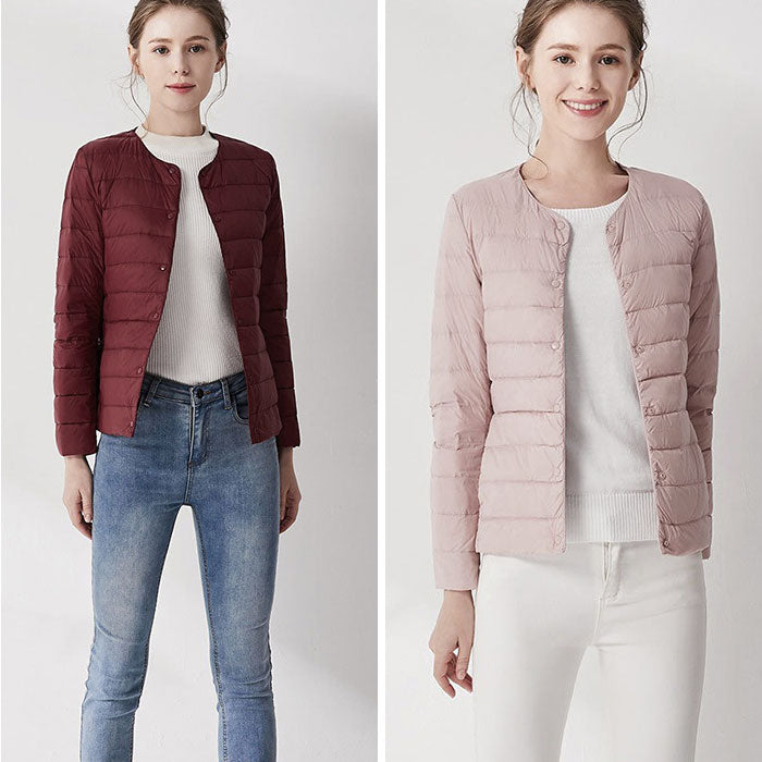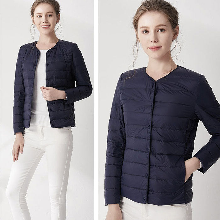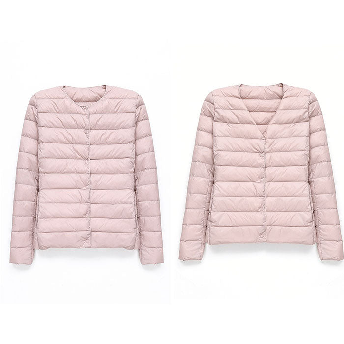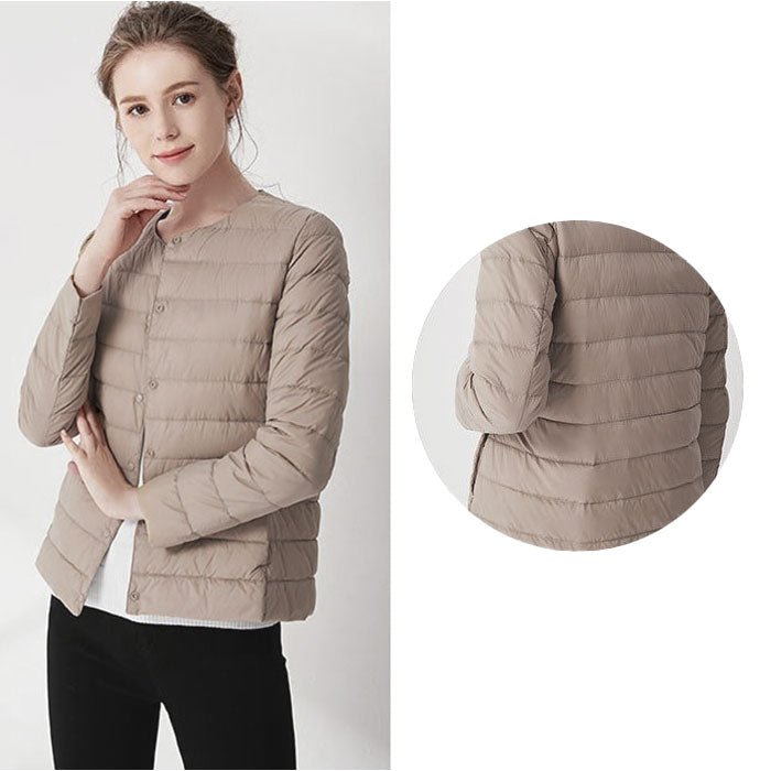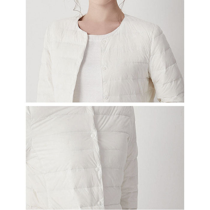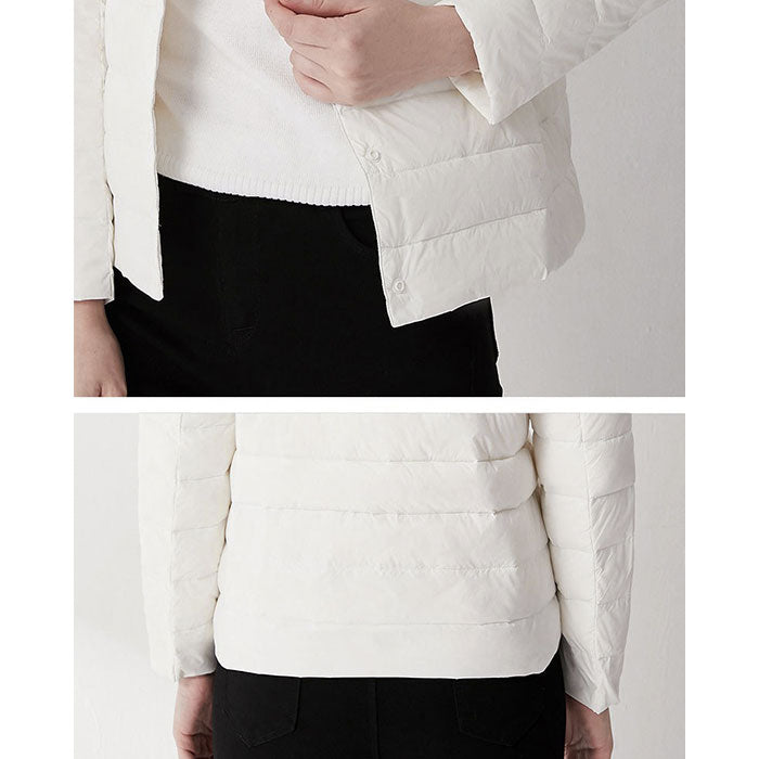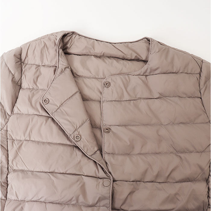 ダウンジャケット レディース ショート フードなし 通販 インナーダウン ライトダウン 中綿 コート 暖かい 防寒 軽量 ジャケット 無地 ノーカラー 長袖 ダウン ショート丈 秋冬 v首