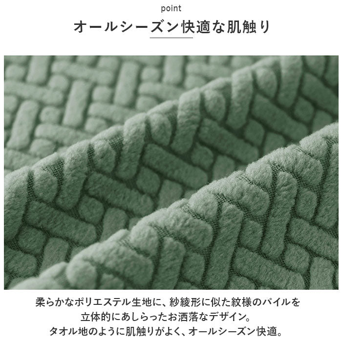 ・柔らかなポリエステル生地に、紗綾形に似た紋様のパイルを立体的にあしらったお洒落なデザイン。タオル地のように肌触りがよく、オールシーズン快適。(※ポリエステル素材に優れた伸縮性をもたらすポリウレタン弾性繊維を配合した生地を使用しています。)