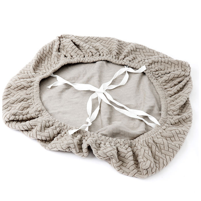 ・カバーをすっぽりと被せたら、座面裏側でストラップ紐をキュッとしばって取り付け簡単!カバー裾部の伸縮ゴムが座面の4隅をぴったり捉え、ズレやヨレのないきちんと感のある仕上がりに。