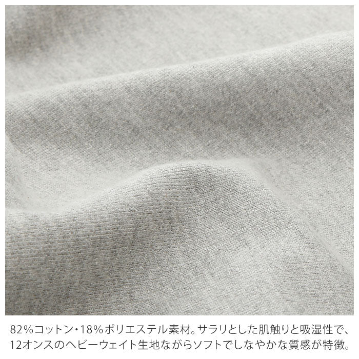 ・82%コットン・18%ポリエステル素材(※)。サラリとした肌触りと吸湿性で、12オンスのヘビーウェイト生地ながらソフトでしなやかな質感が特徴。(※CharcoalHeather・OxfordGreyのみ素材の組成が異なります。)