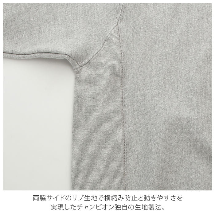 ・リバースウィーブとは、生地を横向きに使用することで縦縮みを軽減し、スウェットの弱点である縮みやすさを克服!さらに両脇サイドのリブ生地で横縮み防止と動きやすさを実現したチャンピオン独自の生地製法。