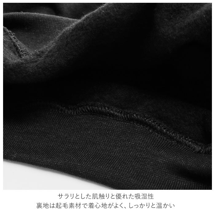 ・50%コットン・50%ポリエステル素材。サラリとした肌触りと優れた吸湿性。裏地は起毛素材で着心地がよく、しっかりと温かい。