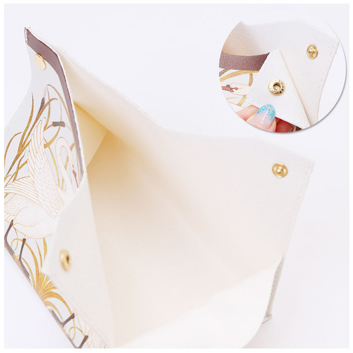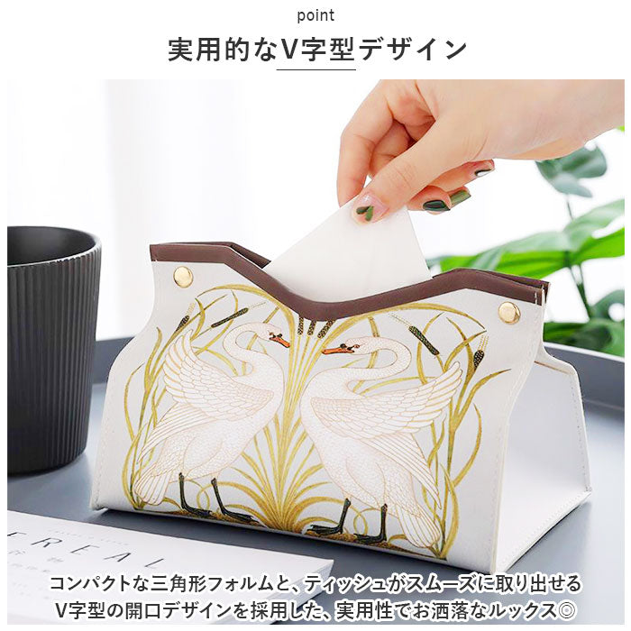 ・くすみカラーの背景に、翼を広げる白鳥や咲き誇る花を繊細なタッチで描きだしたエレガントなデザイン。カバーを掛けるだけで、生活感が出てしまいがちなティッシュがオシャレに変身!