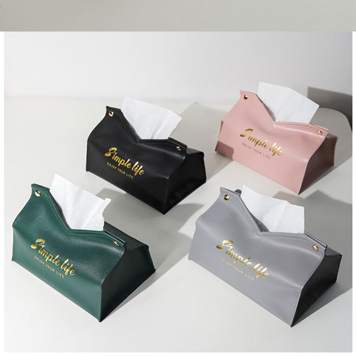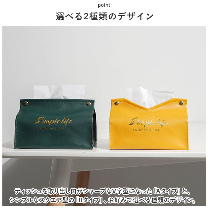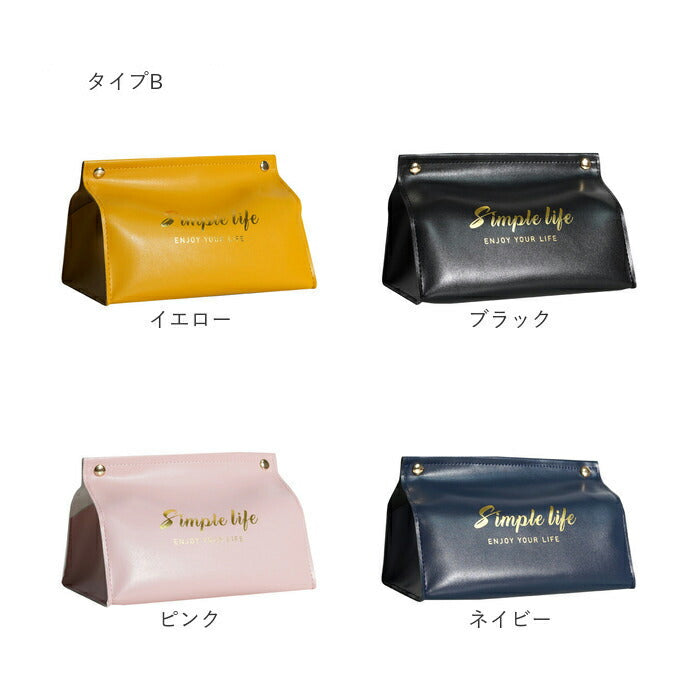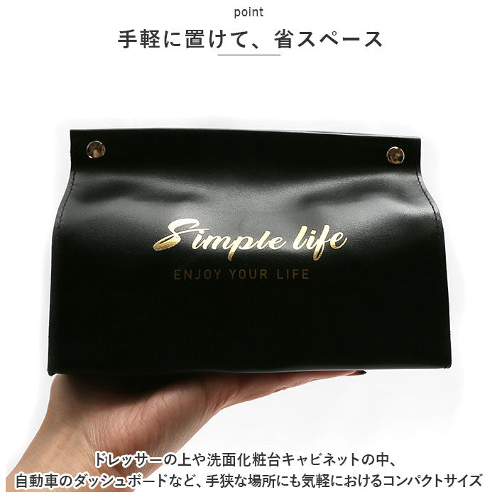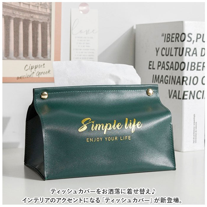 ・カラフルなフェイクレザー生地に、ゴールドで箔押しした「Simple Life -ENJOY YOUR LIFE-」のセンテンスがワンポイント。カバーを変えるだけで、ティッシュがグッとエレガントに変身♪