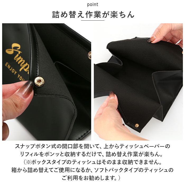 ・スナップボタン式の開口部を開いて、上からティッシュペーパーのリフィルをポンッと収納するだけで、詰め替え作業が楽ちん。(※ボックスタイプのティッシュはそのまま収納できません。箱から詰め替えてご使用になるか、ソフトパックタイプのティッシュのご利用をお勧めします。)