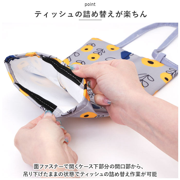 ・面ファスナーで開くケース下部分の開口部から、吊り下げたままの状態でティッシュの詰め替え作業が可能。(※ボックスタイプのティッシュはそのまま収納できません。箱から詰め替えてご使用になるか、ソフトパックタイプのティッシュのご利用をお勧めします。)