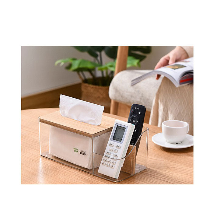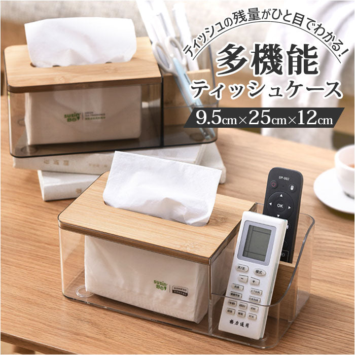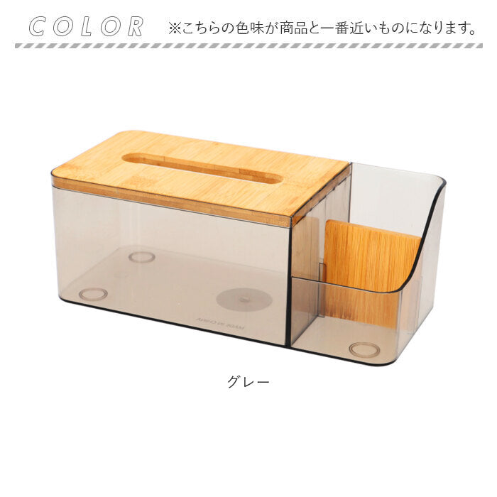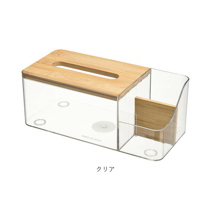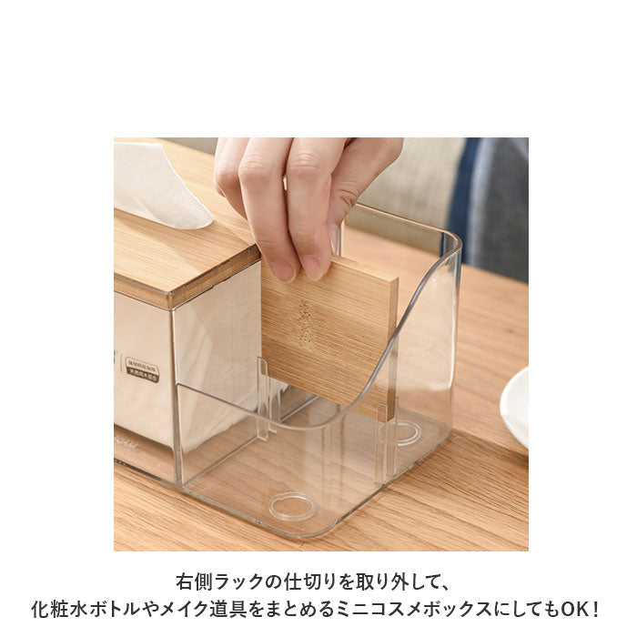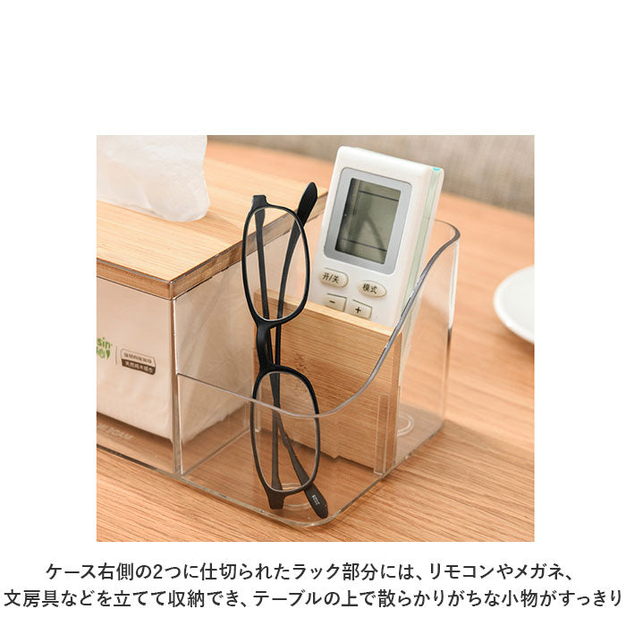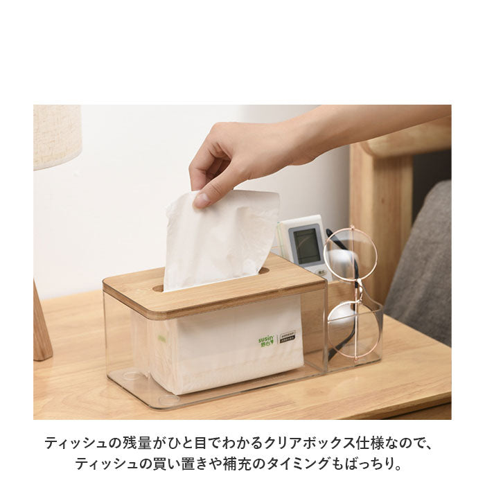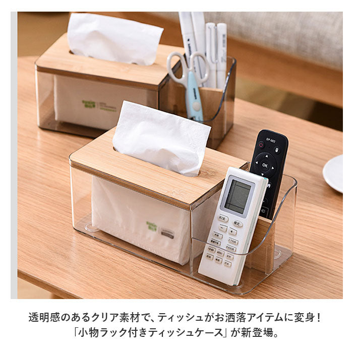 ・透明感のあるクリア素材で、ティッシュがお洒落アイテムに変身!「小物ラック付きティッシュケース」が新登場。