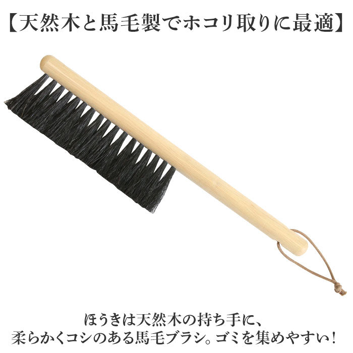 ・ほうきは天然木の持ち手に、柔らかくコシのある馬毛ブラシ。ゴミを集めやすい!