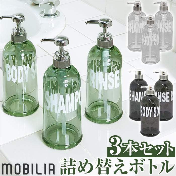 ・デザインは「シャンプー」「リンス」「ボディソープ」の3種類。カラーは「グリーン」「ダークグレー」「クリア」の3カラー。カラーを統一するだけで、ワンランク上の空間を演出♪