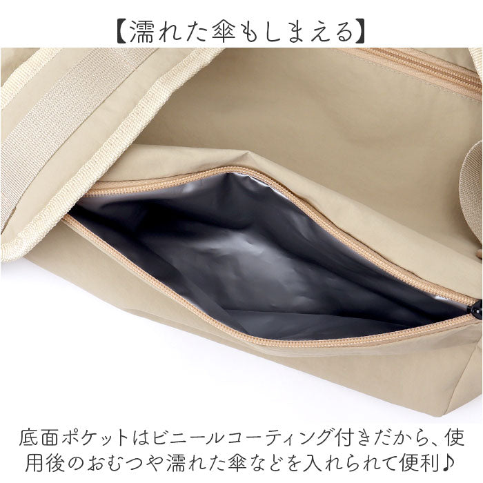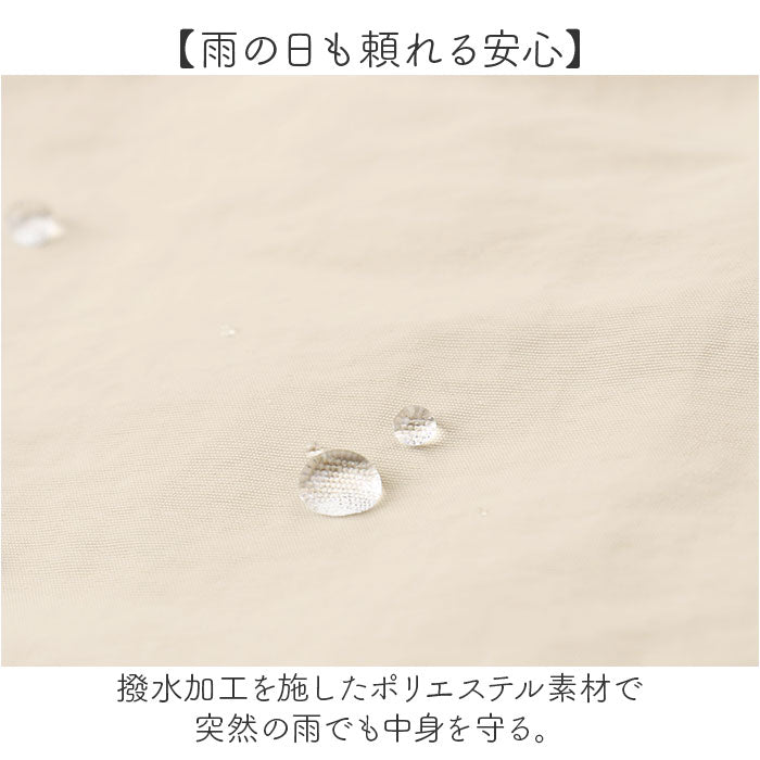 ・撥水加工を施したポリエステル素材で突然の雨でも中身を守る。