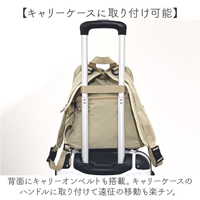 ・背面にキャリーオンベルトも搭載。キャリーケースのハンドルに取り付けて遠征の移動も楽チン。