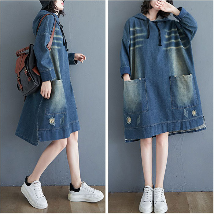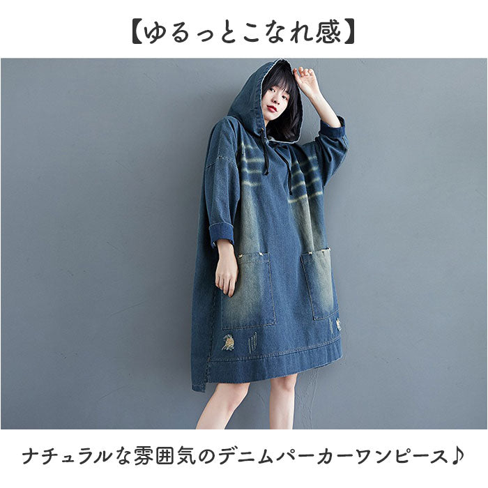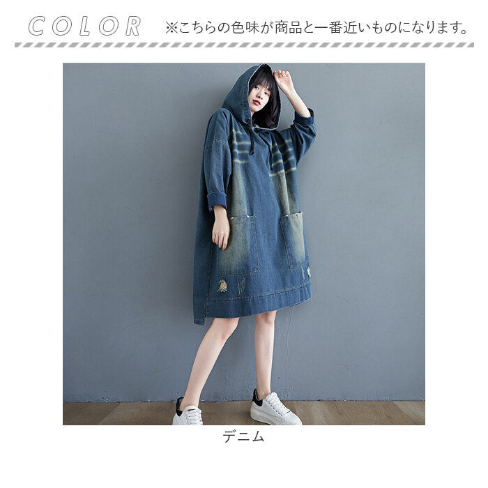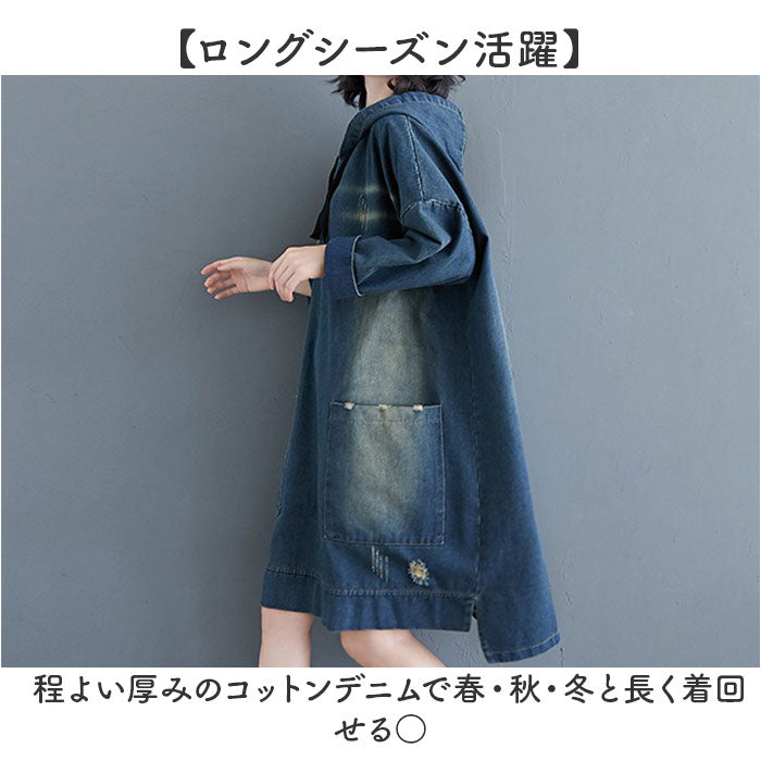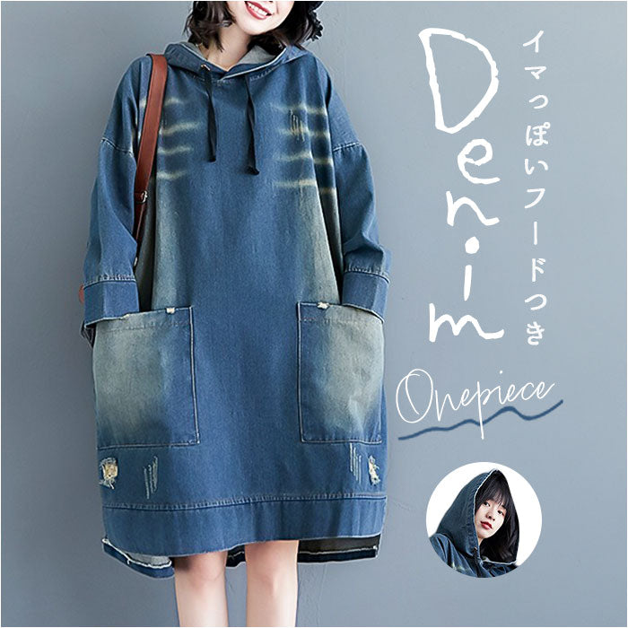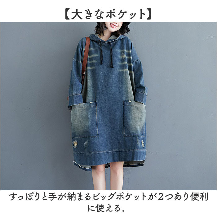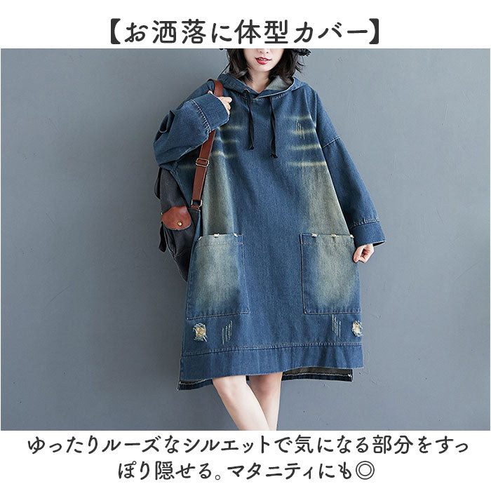 デニム パーカー ワンピース レディース 通販 デニムワンピース パーカーワンピース デニムパーカー スカート 体型カバー 長袖 ゆったり ひざ丈 膝丈 大人 フード付き フード カジュアル