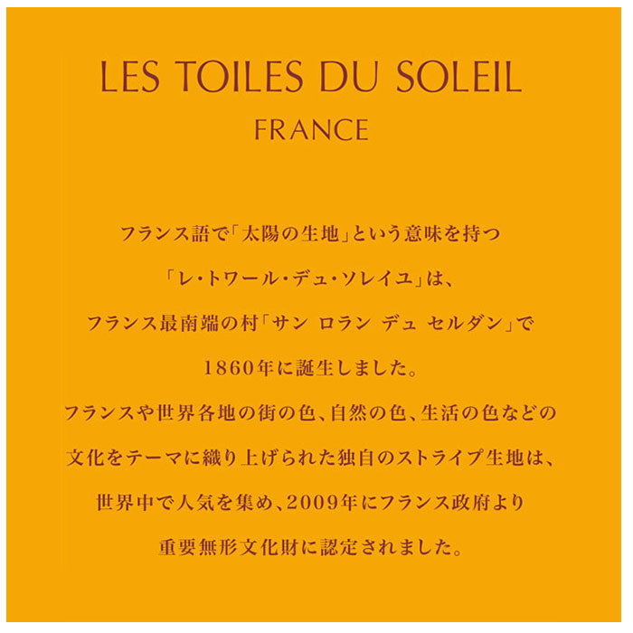・「レ・トワール・デュ・ソレイユ」とは、フランス語で「太陽の生地」という意味。フランスや世界各地の街の色、自然の色、生活の色などの文化をテーマに織り上げられた独自のストライプ生地は、世界中で人気を集め、重要無形文化財に認定。