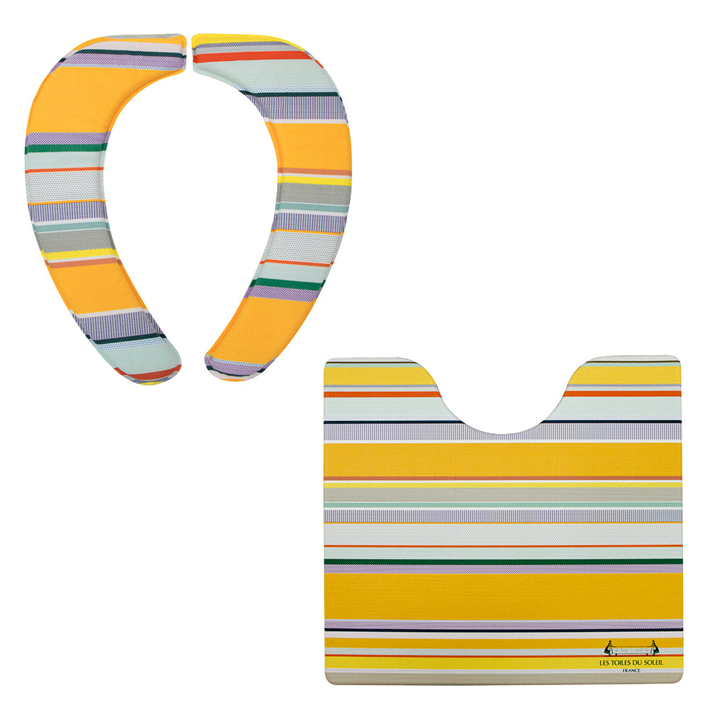 ・「レ トワール デュ ソレイユ」の格調高いストライプ柄を用いたファブリックシリーズから、「トイレ2点セット 足元マット&便座クッション」が発売。