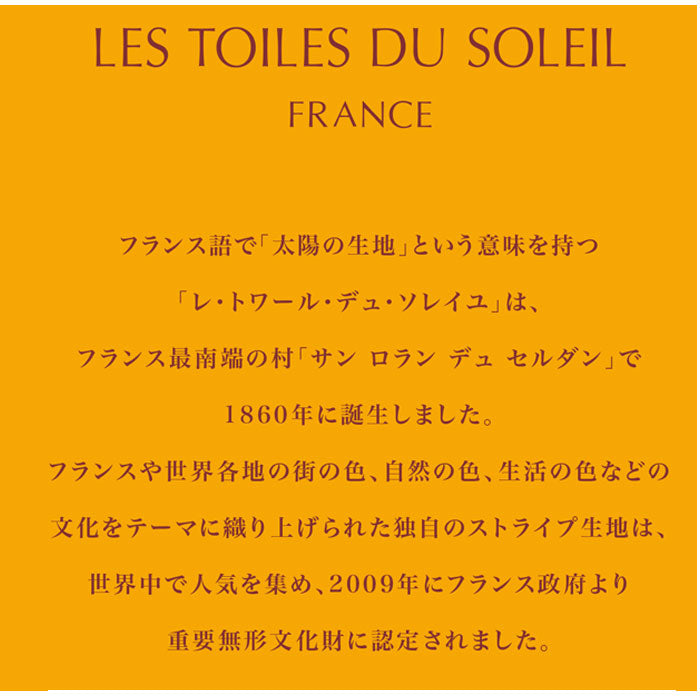 ・「レ・トワール・デュ・ソレイユ」とは、フランス語で「太陽の生地」という意味。フランスや世界各地の街の色、自然の色、生活の色などの文化をテーマに織り上げられた独自のストライプ生地は、世界中で人気を集め、重要無形文化財に認定。