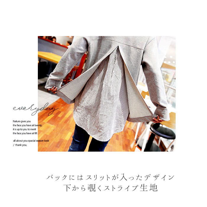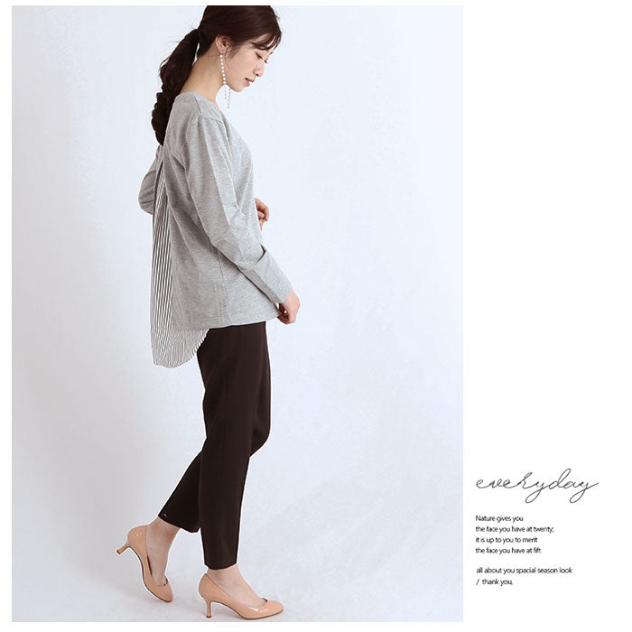 ・バックにはスリットが入ったデザイン。下から覗くストライプ生地が、カジュアルになりすぎない印象。