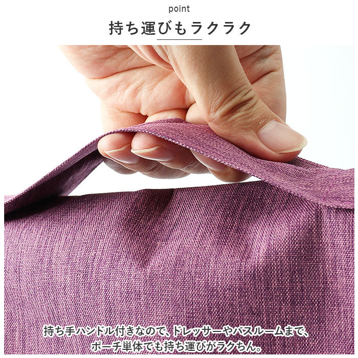 ・持ち手ハンドル付きなので、ドレッサーやバスルームまで、ポーチ単体でも持ち運びがラクちん。
