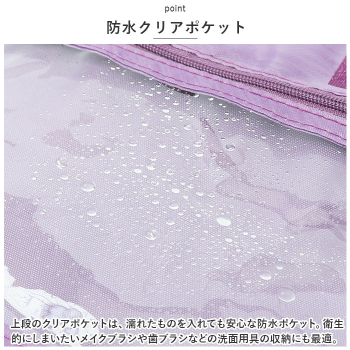 ・上段のクリアポケットは、濡れたものを入れても安心な防水ポケット。衛生的にしまいたいメイクブラシや歯ブラシなどの洗面用具の収納にも最適。