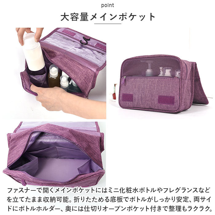 ・ファスナーで開くメインポケットにはミニ化粧水ボトルやフレグランスなどを立てたまま収納可能。折りたためる底板でボトルがしっかり安定、両サイドにボトルホルダー、奥には仕切りオープンポケット付きで整理もラクラク。