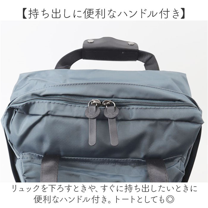 ・リュックを下ろすときや、すぐに持ち出したいときに便利なハンドル付き。トートとしても◎